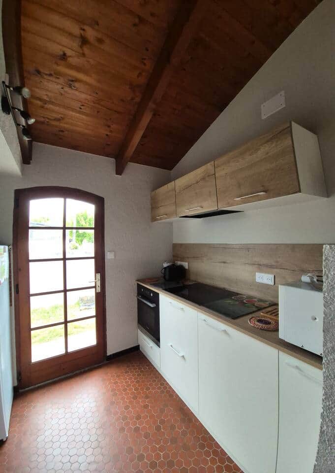 - Et la cuisine en L comprenant : plaque à induction, four électrique, micro-ondes, réfrigérateur et congélateur, bouilloire, cafetière à filtre et grille pains.