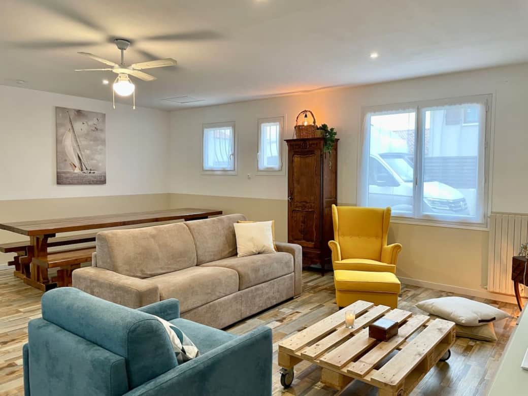 - Le salon avec canapé convertible Grand Confort et fauteuils, TV et plusieurs meubles de rangements.