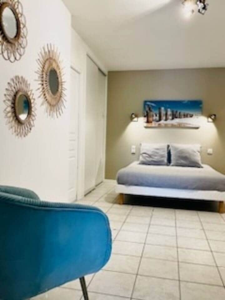 La salle d’eau est composé d’un meuble avec vasque posé, d’une douche à l’italienne Un sèche-cheveux est laissé à disposition. Le WC est séparé. WIFI à disposition.