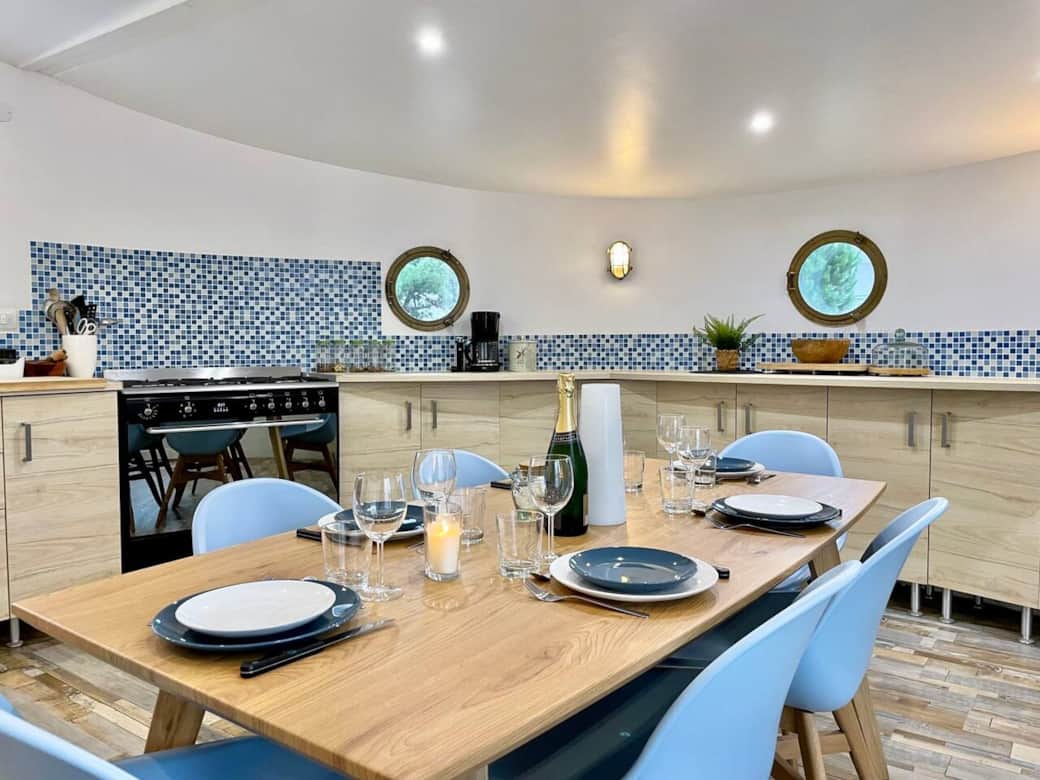 Une vaste cuisine aménagée et équipée, avec table à manger et 6 chaises :