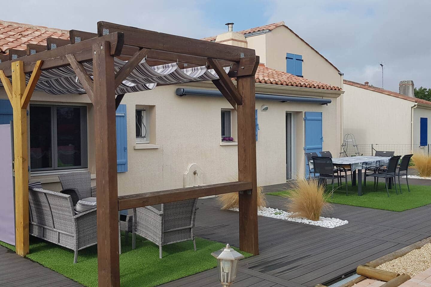 Arrière de la maison, il s'agit d'une grande terrasse aménagée et équipée pour la détente, sans vis-à-vis. Elle est équipée d'une grande table avec chaises, d'un grand barbecue fixe, d'un petit salon ombragé et de chaises longues.