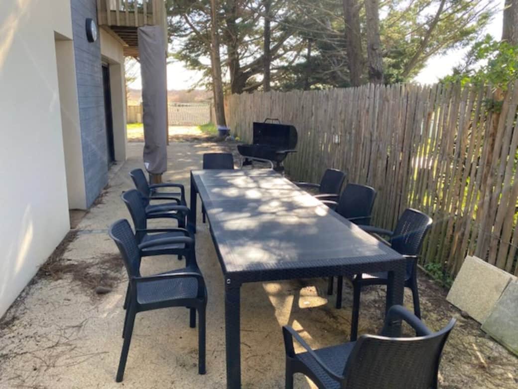 L'espace extérieur comprend une grande table à manger et chaises, un grand barbecue, un braséro et plusieurs transats.